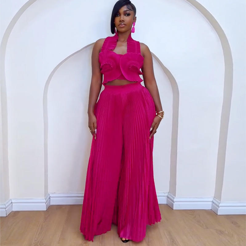 Ensemble Deux Pièces Grande Taille pour Femme Comprenant un Haut Court Plissé à Col Licou de Couleur Unie et un Pantalon Long Ample pour l'Été et l'Automne